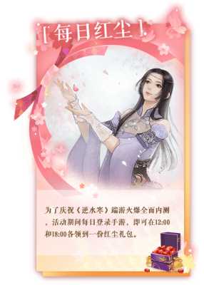 為慶祝《逆水寒》端游的火爆,活動期間可每天登錄手機游戲,可分別在12:00、18336000獲得紅塵禮包。