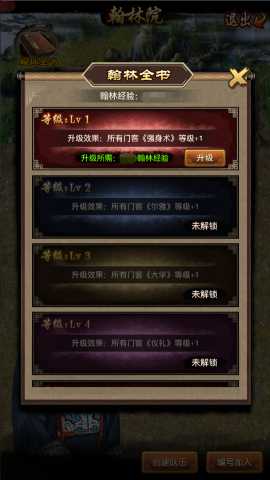 例子:翰林全書等級(jí)lv1升級(jí)后,所有門客《強(qiáng)身術(shù)》等級(jí)+1