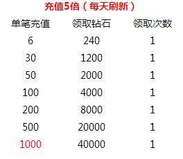 活動內容:活動期間,玩家充值對應檔次的金額,可在活動中心額外領取四倍鉆石返還,海量鉆石來襲,戰斗力升不停!(每日刷新)