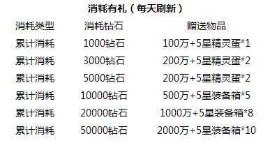 活動內容:活動期間,玩家每日累計消費鉆石達到指定額度,即可在活動中心領取大量金幣和五星寶箱。每個檔次每日限參與一次。(每天刷新)
