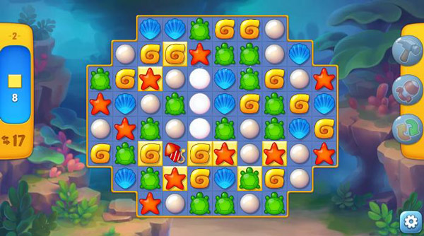 此游戲的三消部分與目前市場上的大多數(shù)三消游戲類似。除了消除三顆寶石外,四、五、T等花式消除可以生成特殊寶石,觸發(fā)特殊效果。形成大面積消除。如果您在三消關(guān)卡中滿足要求,則可以通過關(guān)卡并獲得金幣。使用金幣可以購買各種魚類和家具。